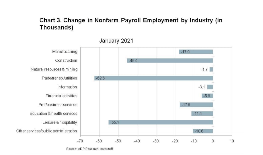 “January reported a decrease in jobs, the largest decrease since May 2020 during the lockdown period,” said Nela Richardson, chief economist, ADP. “The surge in COVID-19 cases and public health restrictions resulted in mass layoffs. Job losses were reported in every sector, led by trade, transportation and utilities; leisure and hospitality; and construction.”